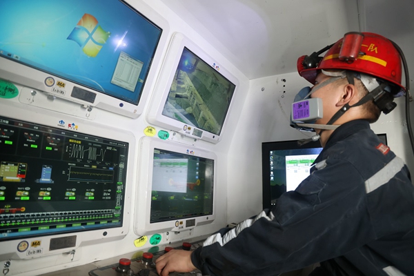 (員工在集控室操作450米超長智能綜采工作面開采運行)