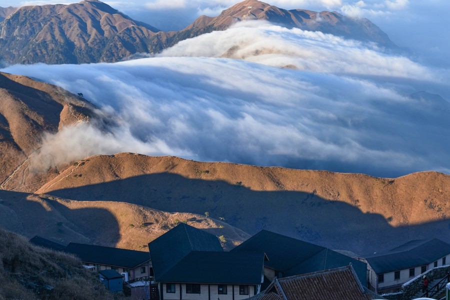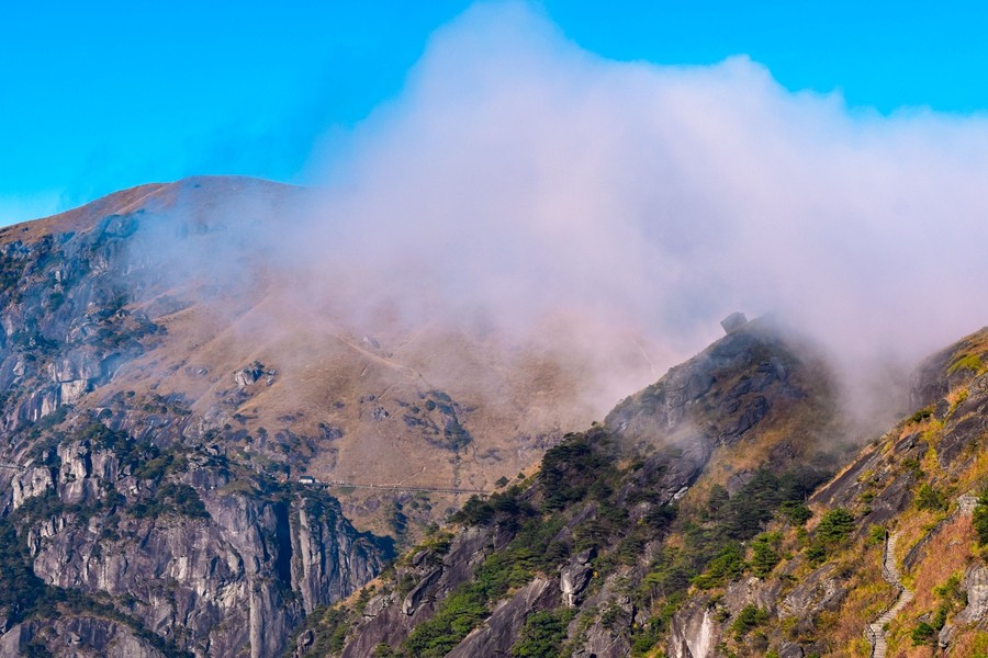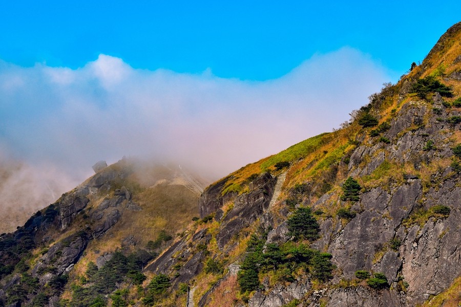 武功山風光旖旎,海拔高差1600米,為景觀奇特的花崗巖和混合巖地貌,紅壤、黃壤、黃棕壤、高山草甸沿海拔高度梯型分布。云海非煙非霧,如詩如幻,氣勢恢宏,波瀾壯闊,讓人感到厚重與飄逸。(段明亮)